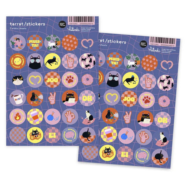 Pakkaus sisältää kaksi samanlaista A5 kokoista tarra-arkkia. Yhdessä tarra-arkissa on 30 erilaista pyöreää tarraa, aiheina kissa, käsimerkkejä, harraste ym. Sininen tausta, tarroissa keltaista, oranssia, mustaa, valkoista, vaaleansinistä. Tarrat sopivat esimerkiksi bujoiluun, koristeluun ja askarteluun. Kotimainen tuote.