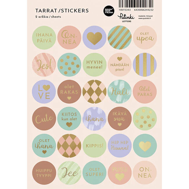 Pakkaus sisältää kaksi samanlaista A5 kokoista tarra-arkkia. Yhdessä tarra-arkissa on 30 erilaista pyöreää tarraa, folioituja yksityiskohtia. Aiheina graafisia kuvioita ja erilaisia tekstejä, esim. Olet ihana, Hip hip hurraa, Onnea, Jee, Kiitos kun olet, Hyvin menee! Tarra-arkissa on murretut pastellisävyt. Tarrat sopivat esimerkiksi bujoiluun, koristeluun ja askarteluun. Kotimainen tuote.