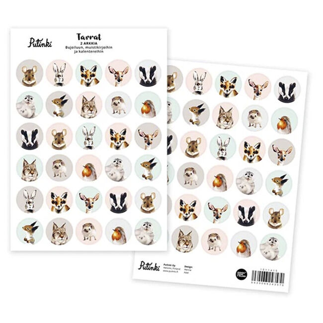 Pakkaus sisältää kaksi samanlaista A5 kokoista tarra-arkkia, joissa on erilaisia eläinhahmoja. Yhden tarran halkaisija 24 mm. Tarrat sopivat esimerkiksi bujoiluun, koristeluun ja askarteluun. Design: Henna Adel