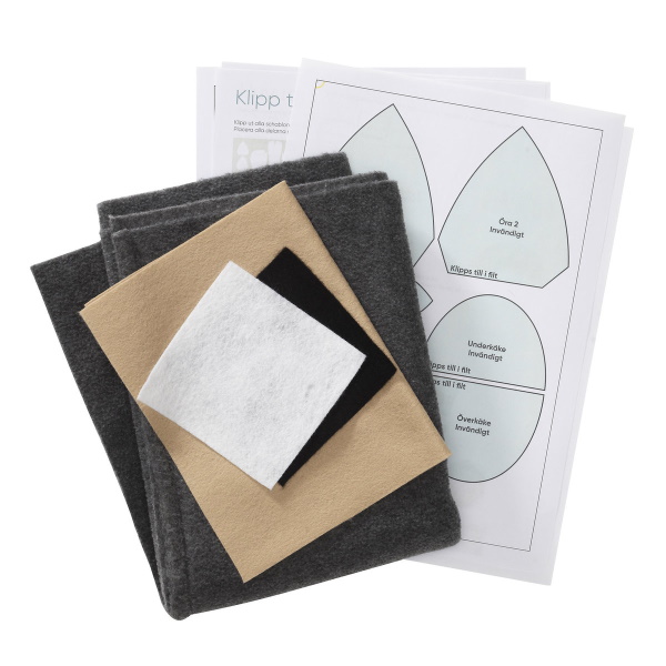 Pakkaus sisältää 1 opaslehden, 2 kappaletta huopaa 10x10 cm (musta ja valkoinen), 1 kappaleen huopaa 20x30 cm (hiekka) ja fleece-kappaletta (harmaa melange) 75x50 cm. Tarvitset myös seuraavat (ei sisälly toimitukseen): Kerä puuvillaa merinolankaa (50 grammaa) mistä tahansa väristä harjaa varten, puukeppi, 225 grammaa pehmustetta, ompeluneula, vahva ompelulanka, kangasliima, sakset.