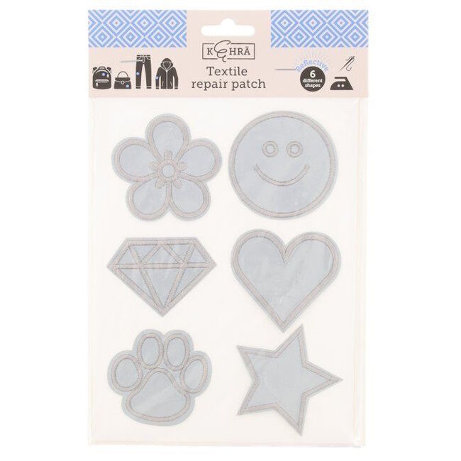Muotoonleikattu tekstiilipaikka heijastavalla pinnalla. Soveltuu pienten reikien paikkaamiseen ja vaatteiden/asusteiden koristamiseen. Pakkaus sisältää 6 heijastavaa tekstiilipaikkaa. Kiinnitys silittämällä tai ompelemalla.