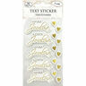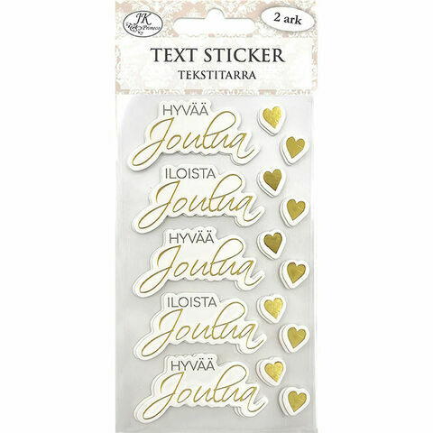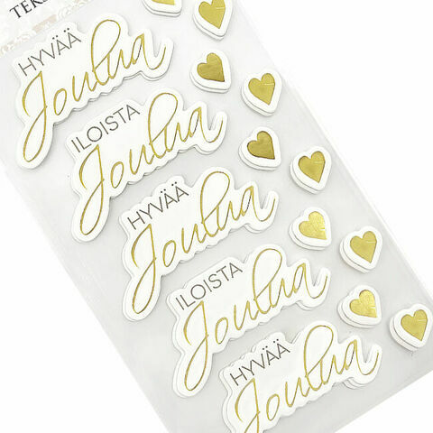 Tekstitarrat askarteluun ja koristeluun. Pakkaus sisältää kaksi arkkia kartonkisia tarroja eli yhteensä 10 tekstitarraa sekä 20 sydäntarraa. Tarroissa on kultainen foliopainatus.