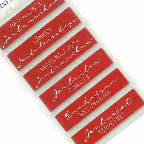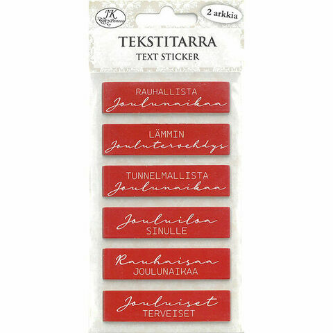 Tekstitarrat askarteluun ja koristeluun. Pakkaus sisältää kaksi arkkia kartonkisia tarroja eli yhteensä kaksitoista tarraa.