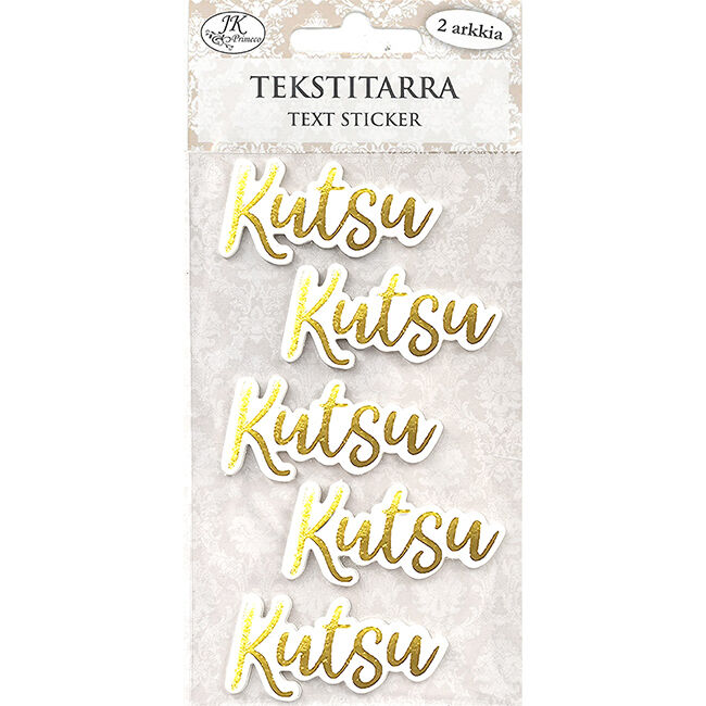Tekstitarrat askarteluun ja koristeluun. Pakkaus sisältää kaksi arkkia kartonkisia tarroja eli yhteensä kymmenen tarraa kultaisella foliopainatuksella.