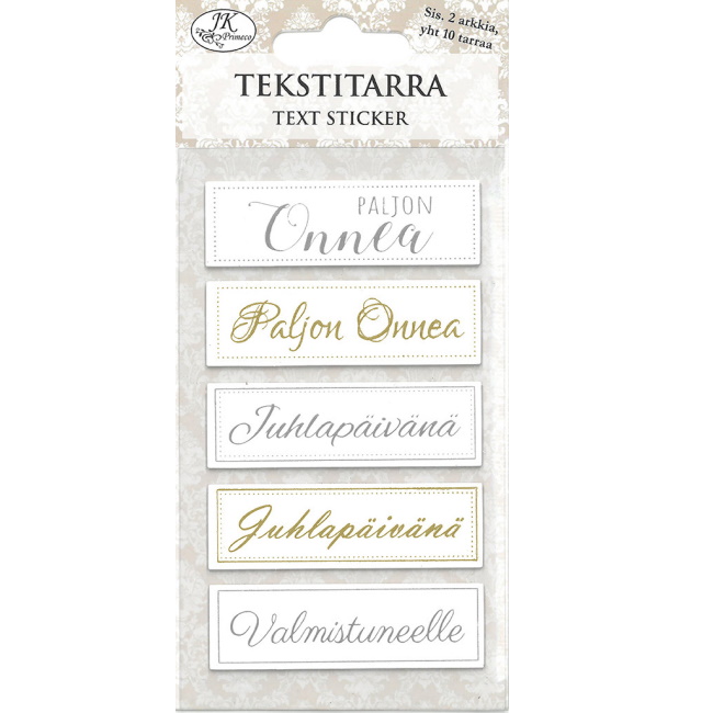 Pakkauksessa 2 arkkia, 5 tarraa/arkki. Yhden tarran koko 1,9 x 6cm.