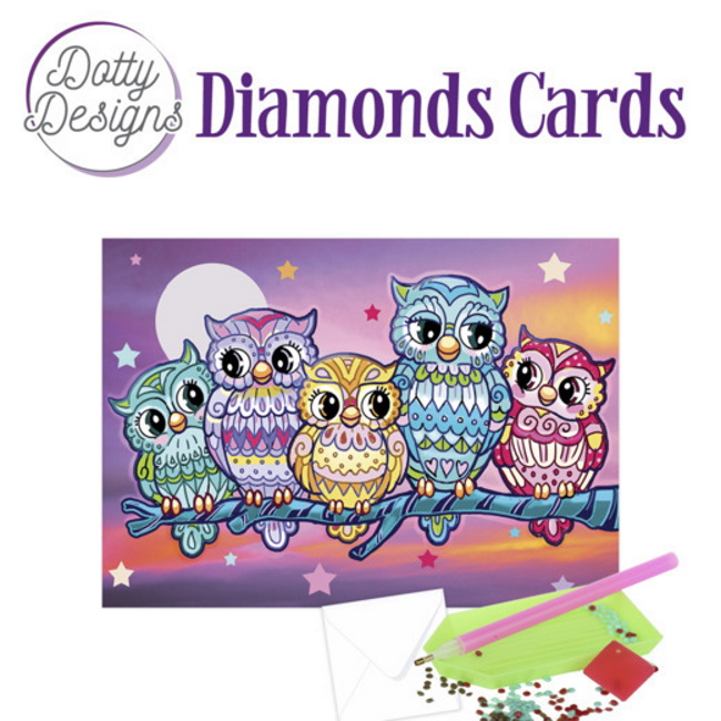 Näistä Dotty Designsin timanttikorttisarjoista löydät kaikki materiaalit yhdelle kortille, jossa on osa timanttimaalausta. Jokainen pakkaus sisältää esipainetun kortin + kirjekuoren, tarpeeksi kiviä, kynän, vahan ja tarjottimen.