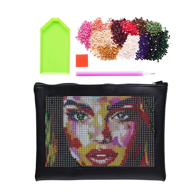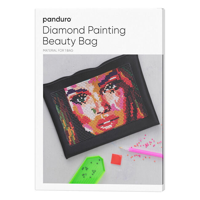 Timanttimaalaus on hieman maalaamista numeroiden mukaan, hieman helmityötä, hieman askartelua ja paljon tarkkuutta. Tällä kertaa aihetta ei kuitenkaan paineta kankaalle – vaan mustaan keinonahkaiseen vetoketjulliseen meikkilaukkuun, jonka koko on 21,5 × 15,5 cm!