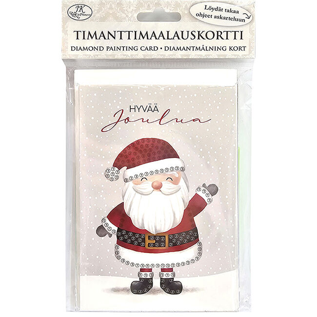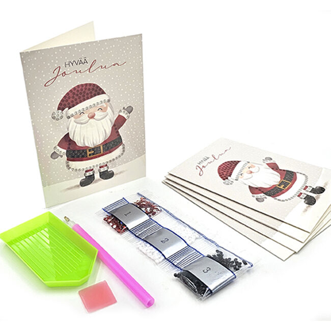 Timanttimaalauskortti askarteluun. Kiinnitä timantit korttipohjaan ja luo upea timanttimaalauskortti! Pakkauksessa on viisi korttipohjaa, vaha, timanttityökalu, astia timanteille ja timantit. Värit on lajiteltu omiin pusseihin numeroittain ja korttipohjaan on merkitty kunkin värin paikka. Pakkauksen takana on tarkemmat ohjeet timanttimaalauskortin askarteluun.