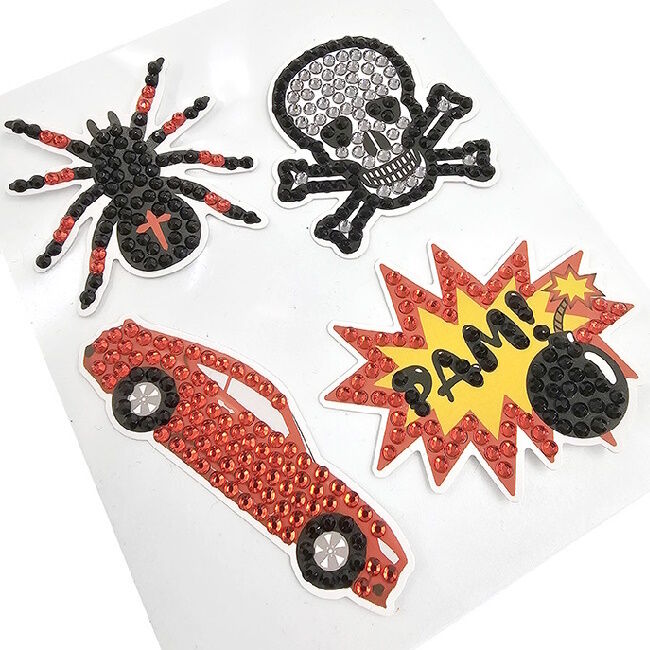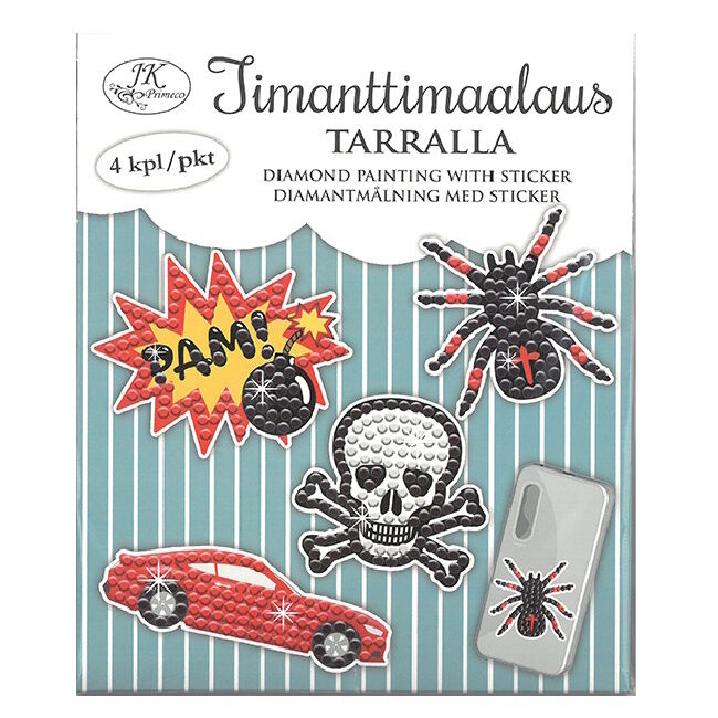 Pakkauksessa neljä erilaista kuviota, joissa tarrakiinnitys takana sekä vaha, timanttityökalu, astia timanteille ja timantit. Pakkauksen takana ohjeet askarteluun.