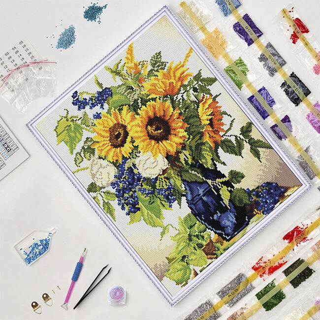 Kaikki yhdessä -pakkaus – kehystetty kangas, ensiluokkaiset timantit, applikaattorikynä, vahatyyny, tarjotin, koukut ja vaiheittaiset ohjeet.