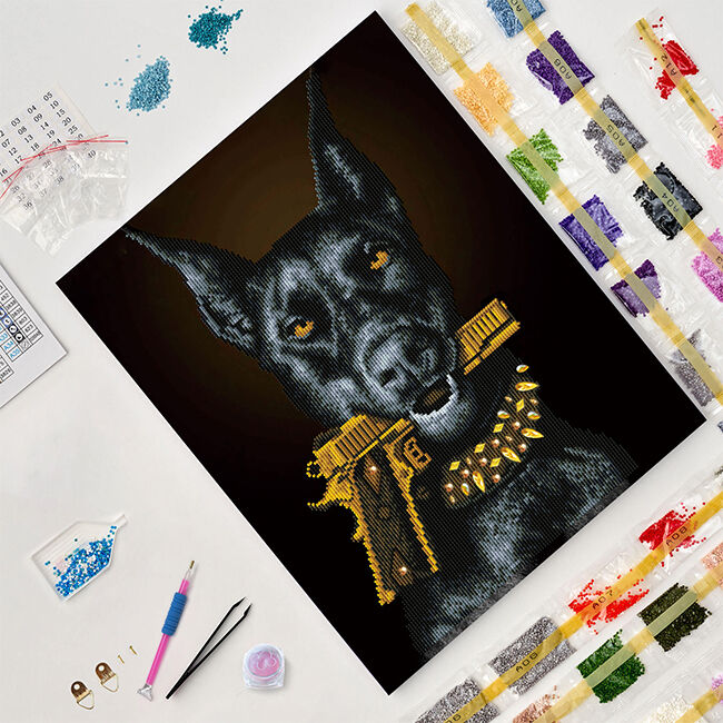 Kaikki yhdessä -pakkaus – kehystetty kangas, ensiluokkaiset timantit, applikaattorikynä, vahatyyny, tarjotin, koukut ja vaiheittaiset ohjeet.