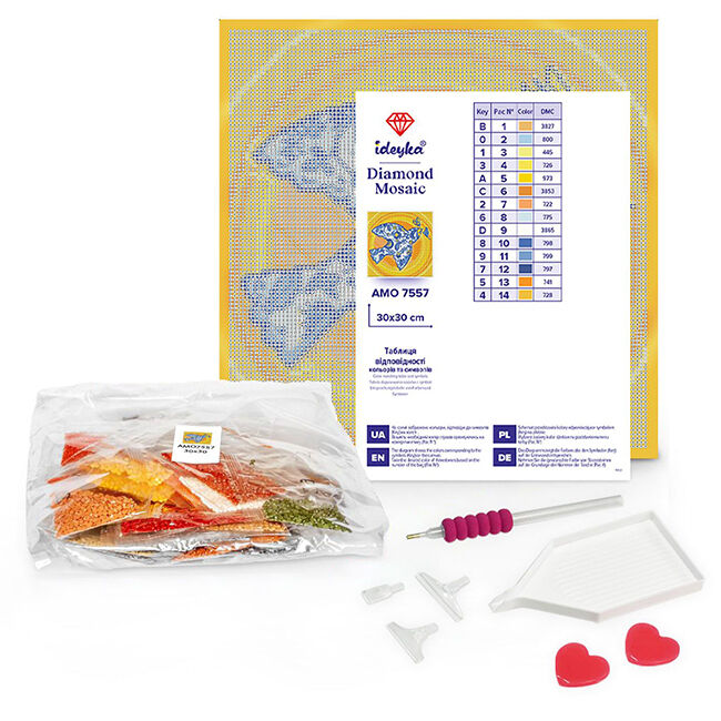5D -timanttimaalaussarja sisältää: öljymaalauskankaan, timanttileikatut värilliset strassihelmet, kivitarjottimen ja kynätyökalut strassihelmien kiinnittämiseen kankaalle. Kankaan taustakuvio on vedenpitävä ja tasalaatuinen, muovipaperilla, jotta kuva pysyy tahmeana ja timantti pysyy paikoillaan, jotta kuva voidaan suojata.