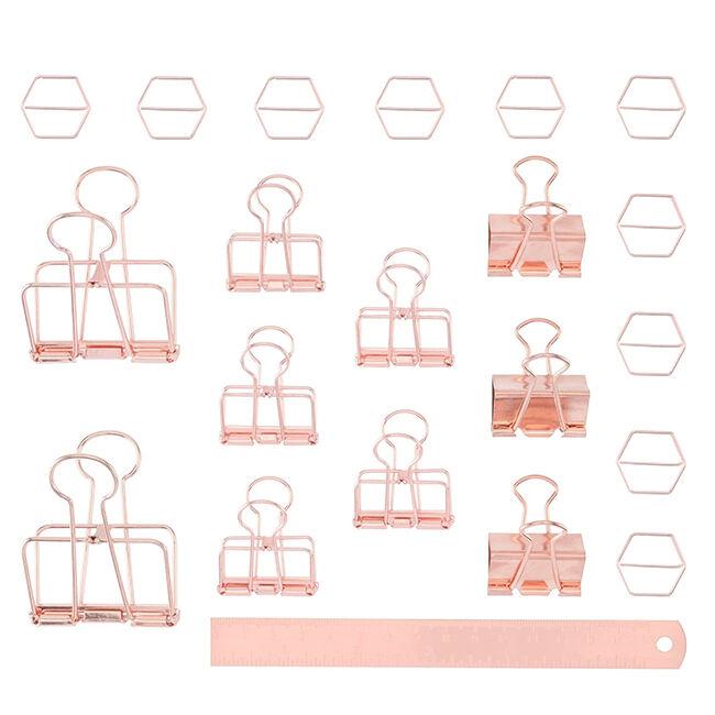 Trendikäs toimistosetti kuparin ja ruusukullan värisenä. Sisältää: 10 lankaklipsiä, 10 paperiliitintä ja 1 viivaimen.
