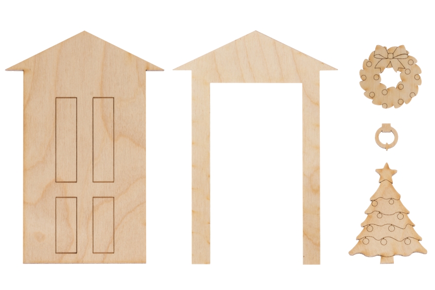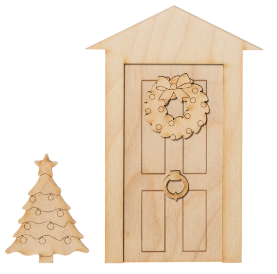 15 x 10 cm. Sisältää: ovi, oven raamit, kuusi, kranssi, kolkutin oveen. 3 mm koivuvaneeri, FSC, koottava, voi maalata, lakata tms, oven korkeus 16 cm, leveys 10 cm.