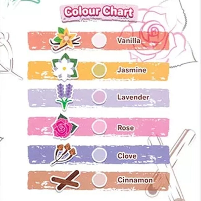 Paketti sisältää 6 tuoksuvaa kynää. Jokaisessa kynässä eri tuoksu: Vanilla, Jasmine, Lavender, Rose, Clove ja Cinnamon.