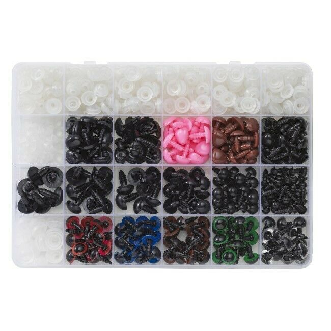 Turvasilmät, turvanenät ja lukitusrenkaat, yhteensä n. 560 kpl. muovia kaikenlaiseen tee-se-itse-työhön tekstiilitöissä, koristeeläimiin, nallekarhuihin, amigurumiin ja kaikkeen, mikä tarvitsee paikallaan pysyviä silmäpareja.