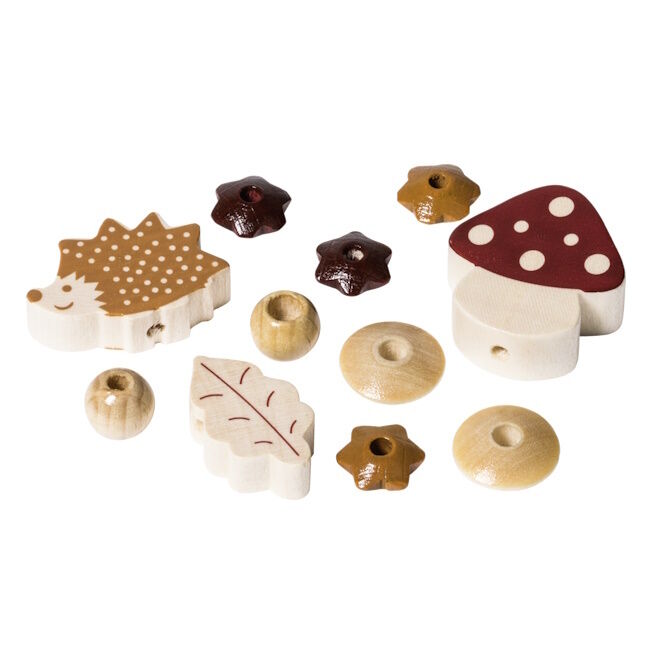 Setti puuhelmiä tuttiketjuun. 11 kpl. Materiaalit: pyökki, vaahtera.