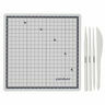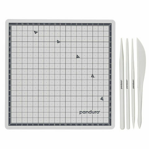 4 savityökalua savelle kaikissa muodoissaan ja 1 leikkuumatto mitatulla ruudukolla. Leikkausmatto on harmaa ja valmistettu joustavasta muovista. Mitallinen työtaso on 18 × 18 cm. 4 savityökalua on valmistettu harmaasta kevyestä muovista. Klassisen saviveitsen lisäksi mukana on kaivertaja/pisteleikkuri, jossa on pyöristetyt päät, ja yksi, jossa on pyöristetty pää ja viisikulmainen kärki. Toisessa työkalussa on myös kaksi erilaista pintakuviointia – yksi viistehiontaan/kolmioon ja toinen puumaisen tekstuurin luomiseen. Kaikki työkalut ovat 17 cm pitkiä.