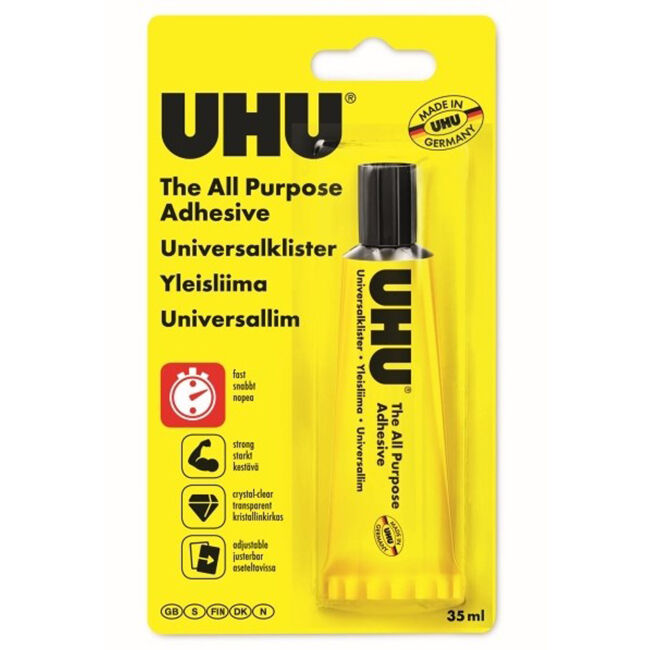 UHU All Purpose Adhesive-liima on nestemäinen synteettinen hartsiliima nopeisiin ja kristallinkirkkaisiin liimauksiin. Soveltuu yleiskäyttöön kotona, toimistossa, mallintamiseen, koulussa, askarteluun ja monessa muussa. Liimaa useita erilaisia materiaaleja nopeasti ja kestävästi. Kun liima on levitetty, se pysyy väliaikaisesti säädettävissä, eikä rypistä mm. paperia.