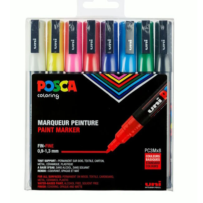 UNI POSCA akryylimaalitussi - kirkkaat värit käytännössä mille tahansa pinnalle. Uni Posca -tussien läpinäkymätön, vesipohjainen muste kuivuu mattapintaiseksi sekä huokoisilla että ei-huokoisilla pinnoilla. Hajuttomat, haalistumattomat ja vuotamattomat tussit sopivat erinomaisesti julisteisiin, kyltteihin, luonnoksiin, kirjaimiin, ja kaavioihin. Käytä niitä paperille, puulle, styroksille, metallille, muoville, vinyylille, lasille ja muille.