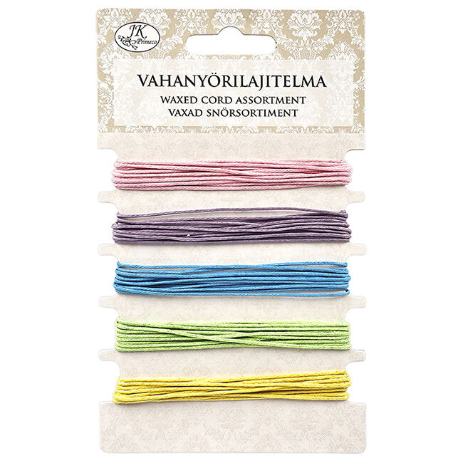Vahanyörilajitelma koruaskarteluun ja muuhun askarteluun. Pakkaus sisältää viisi eri väristä vahanyöriä, jonka paksuus on 0,8mm. Nyörin materiaali on kumi/polyesteri.