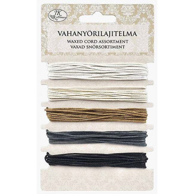 Vahanyörilajitelma koruaskarteluun ja muuhun askarteluun. Pakkaus sisältää viisi eri väristä vahanyöriä, jonka paksuus on 0,8mm. Nyörin materiaali on kumi/polyesteri.