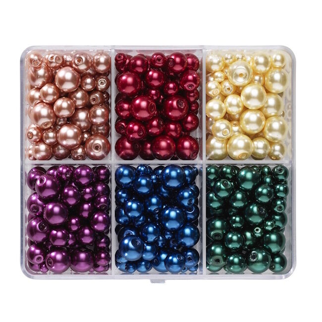Vahatut lasihelmet - noin 480 vahattua lasihelmeä, joilla on ihana kiilto ja miellyttävä paino, jotka saavat korusi sekä tuntumaan että näyttämään hieman ylellisiltä. Helmien laatu näkyy myös niiden tasaisen pyöreässä muodossa. Pakkaus sisältää kuvassa näkyvän väriyhdistelmän ja jokaista väriä on saatavana 4 eri koossa: Ø4, 6, 8 ja 10 mm. Helmien reiän halkaisija on 1,5 mm, lukuun ottamatta pienimpiä helmiä, joissa on 1 mm reikä.