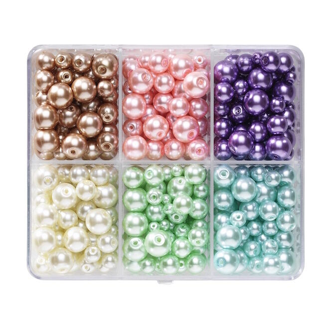 Vahatut lasihelmet - noin 480 vahattua lasihelmeä, joilla on ihana kiilto ja miellyttävä paino, jotka saavat korusi sekä tuntumaan että näyttämään hieman ylellisiltä. Helmien laatu näkyy myös niiden tasaisen pyöreässä muodossa. Pakkaus sisältää kuvassa näkyvän väriyhdistelmän ja jokaista väriä on saatavana 4 eri koossa: Ø4, 6, 8 ja 10 mm. Helmien reiän halkaisija on 1,5 mm, lukuun ottamatta pienimpiä helmiä, joissa on 1 mm reikä.