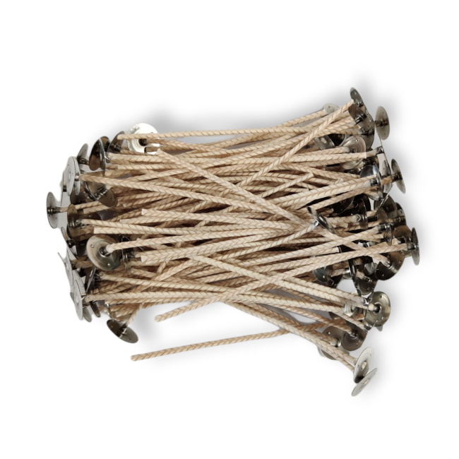 Valmiiksi vahoitettu sydänlanka metallisella tuella soijavaha- ja parafiinikynttilöille halkaisijaltaan noin 5-7 cm.
