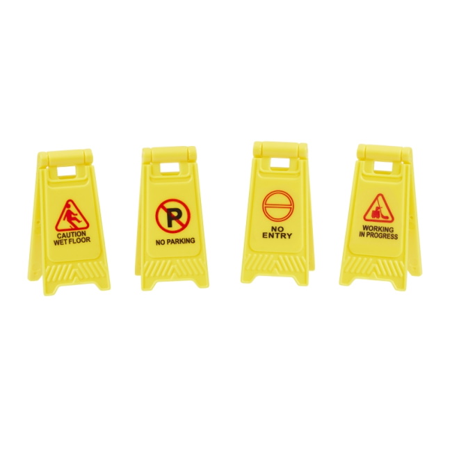Miniatyyri varoituskyltit. Koko noin 2 x 4 cm. 4 kpl.