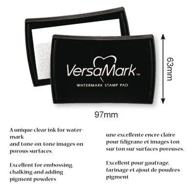 Tämä VersaMark-sarjan Tsukineko-mustetyyny sisältää kirkasta mustetta, jota voit käyttää monin tavoin askartellessasi. VersaMark on tahmea, väritön muste, joka luo vesileimavaikutelman. Leimaa Tsukineko VersaMarkilla päällystämättömälle valkoiselle tai värilliselle paperille ja kuva on muutaman sävyn tummempi kuin paperin väri (tunnetaan myös tone on tone -efektinä).