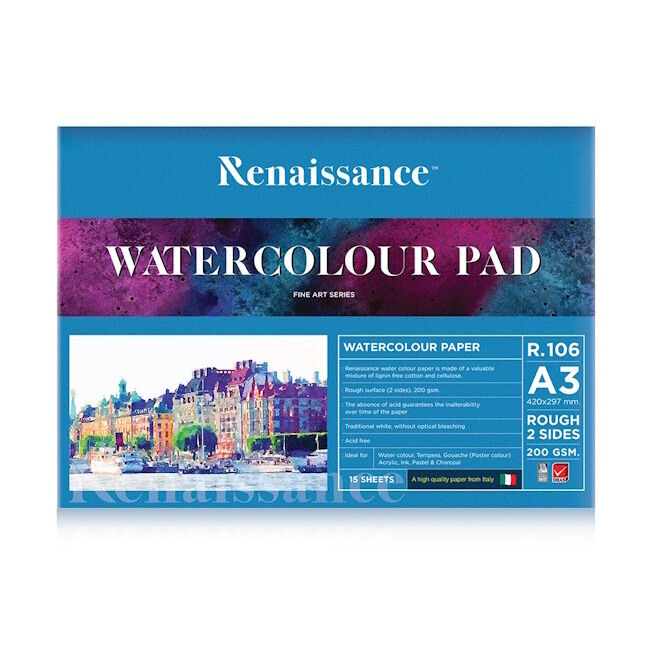 Renaissance maalauslehtiö karkeapintaisella 2-puolisella luonnonvalkoisella paperilla (200 g). Laadukas italialainen paperi on happovapaata, FSC-sertifioitua ja valmistettu 100 % selluloosasta. Paperi imee hyvin vettä ja värejä. Lisäksi paperi säilyy pitkään, ei homehdu eikä kellastu.