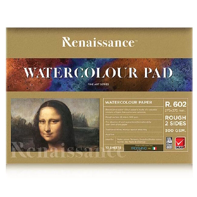 Renaissance maalauslehtiö karkeapintaisella 2-puolisella luonnonvalkoisella paperilla (300 g). Laadukas italialainen paperi on happovapaata, FSC-sertifioitua ja valmistettu 100 % selluloosasta. Paperi imee hyvin vettä ja värejä. Lisäksi paperi säilyy pitkään, ei homehdu eikä kellastu.