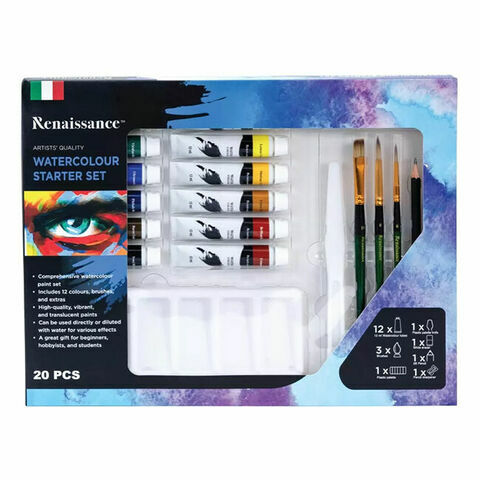Renaissance vesivärimaalauksen aloituspakkaus sisältää 12 väriä, maalauspaletin ja -veitsen sekä kolme sivellintä, lyijykynän ja teroittimen.