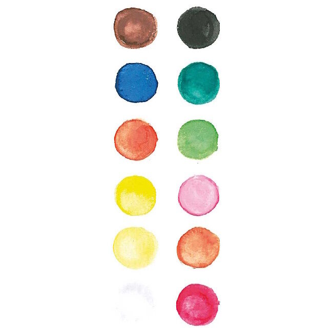 Basic Water Colours -akvarellien, veden ja paperin avulla suuret ja pienet taiteilijat voivat päästää luovan puolensa valloilleen. Yhdessä veden kanssa värit kehittävät loistavan kirkkautensa. Voit työskennellä hyvin pienellä tai suurella määrällä vettä saadaksesi halutun koostumuksen ja värin vahvuuden väristä riippuen. Värit voidaan sekoittaa hyvin keskenään. Irrotettavaa kantta, jossa on lukuisia syvennyksiä voidaan käyttää palettina ja se on helppo puhdistaa.
