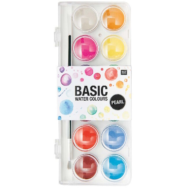 Tämä vesivärilaatikko täydentää BASIC Watercolour -sarjaa intensiivisesti hohtavilla helmiäisväreillä. Maalilaatikko sisältää 12 harmonista väriä ja pienen siveltimen. Värit tulevat omakseen erityisen hyvin tummalla paperilla. Kansi on irrotettava ja siinä on myös kaksitoista sekoituskenttää värien yksilöllistä sekoittamista varten. Tämä helpottaa myös maalilaatikon puhdistamista.