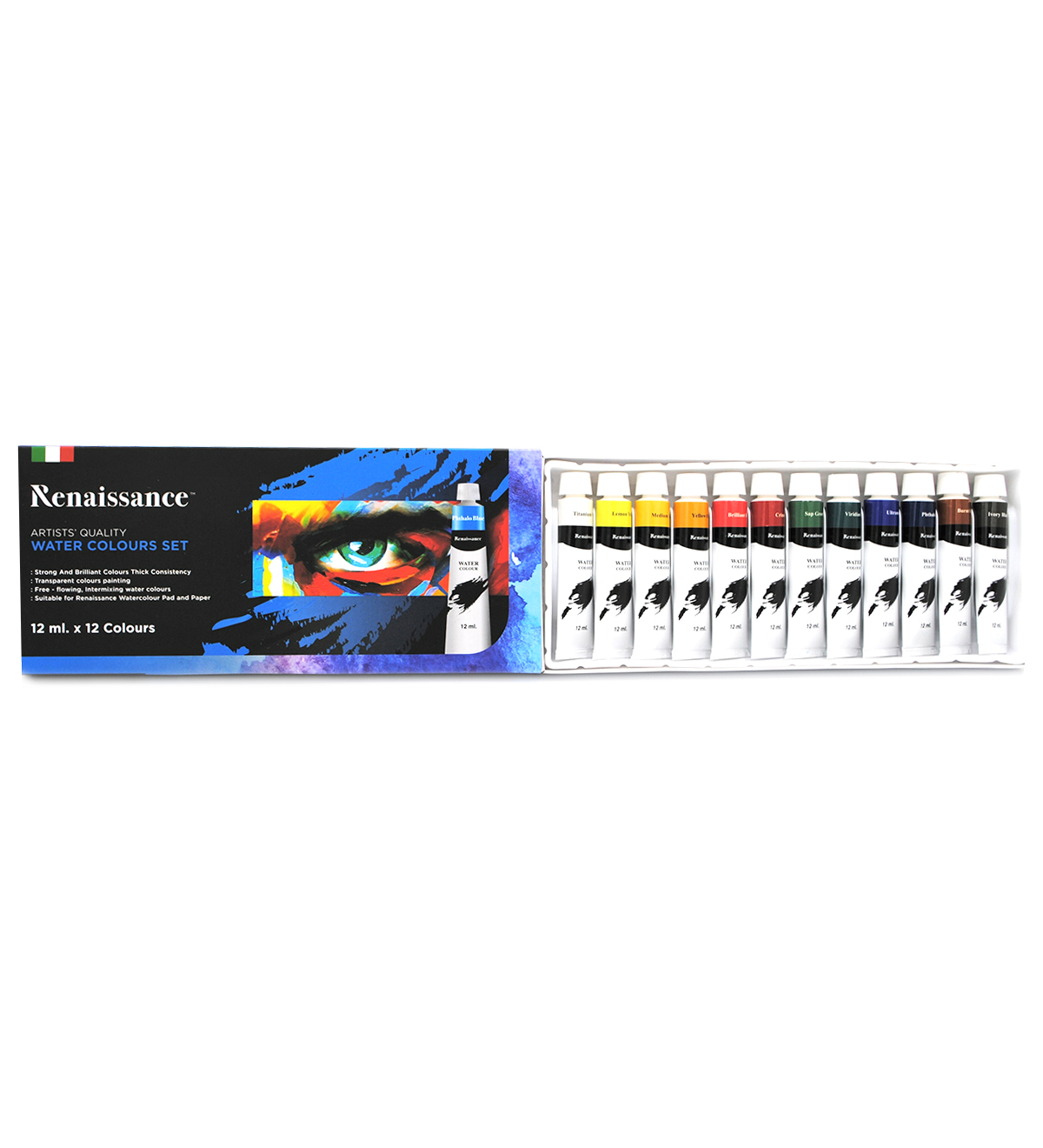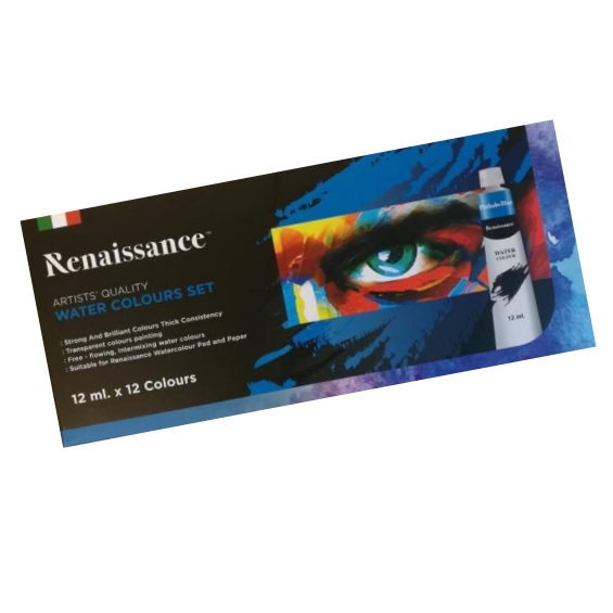 Renaissance akvarellivärit ovat myrkyttömiä ja CE-merkittyjä. Väreissä on vahva pigmentti ja ne levittyvät hyvin. Värit ovat vesiohenteisia eli niitä voi halutessaan ohentaa vedellä. Maalit tulevat kätevissä 12 ml tuubeissa. Pese työvälineet sekä kädet lämpimällä vedellä ja saippualla.