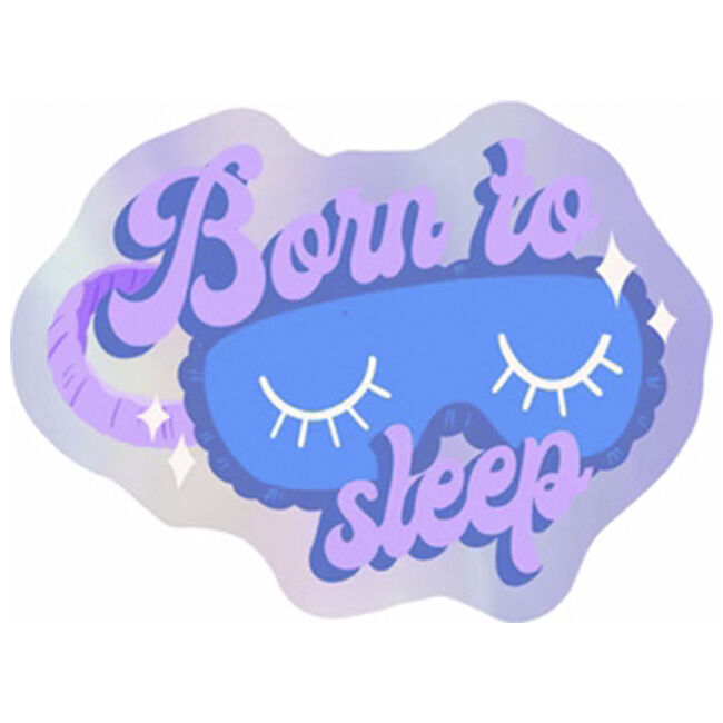 Vinyylitarra, jonka kuvassa on kiinni olevat silmät, tarrassa on teksti "Born to sleep", tehosteena hologrammifoliota.