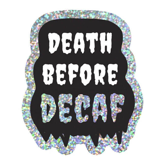 Muototarra, jossa mustalla pohjalla englanninkielinen teksti "Death before decaf", tehosteena glitteriä.