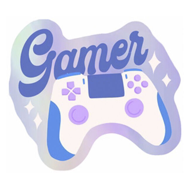 Vinyylitarra, jonka kuvassa on peliohjain ja yläpuolella teksti "Gamer", tehosteena hologrammifoliota.