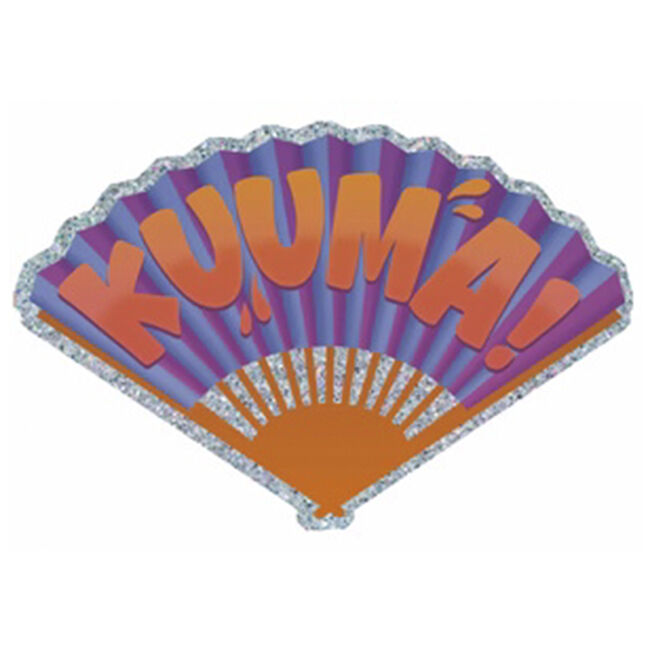 Vinyylitarra, jossa viuhkan muotisella pohjalla teksti "Kuuma!", väreinä violetti ja oranssi, tehosteena glitteriä.