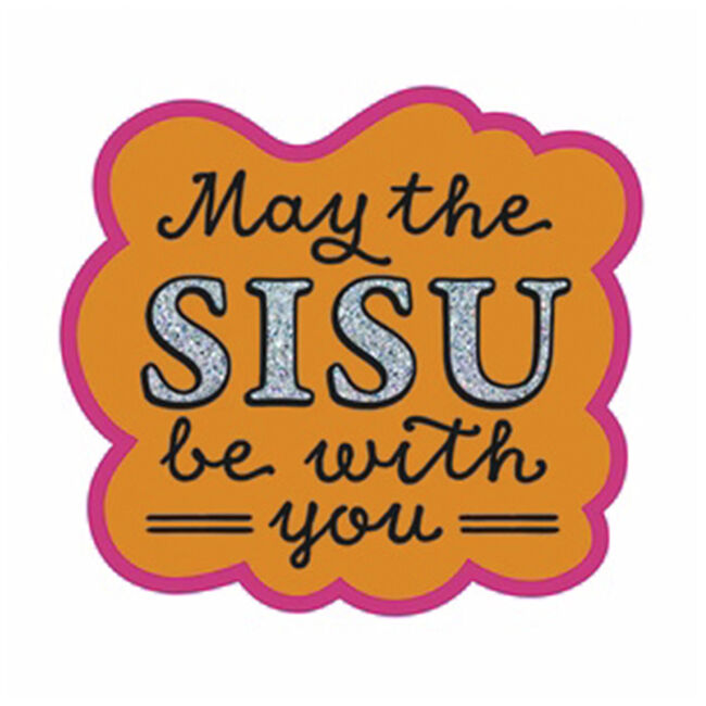 Vinyylitarra, jossa oranssilla pohjalla englanninkielinen teksti "May the SISU be with You", tehosteena glitteriä.