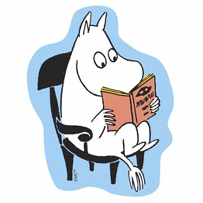 Vinyylitarra, jossa Muumipeikko istuu tuolilla ja lukee kirjaa. Vaaleansininen tausta.