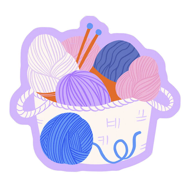 Muototarra, jonka kuvassa on kori täynnä pastellivärisiä lankoja sekä neulepuikot.