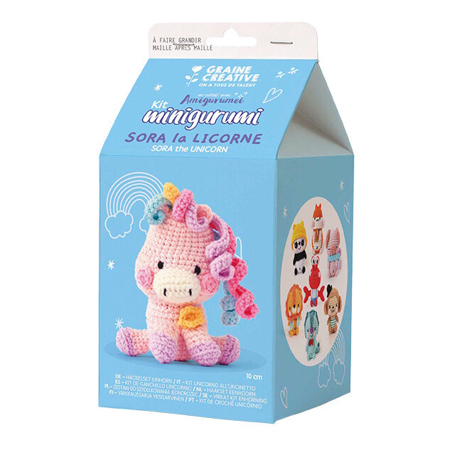 Japanilaista amigurumi-tekniikkaa käyttäen voit virkata söpöjä hahmoja. Tämä askartelupakkaus sisältää kaiken tarvittavan lumoavaan yksisarviseen: erivärisiä lankoja, virkkuukoukun, silmukkamerkkejä, vanua ja ohjeet.