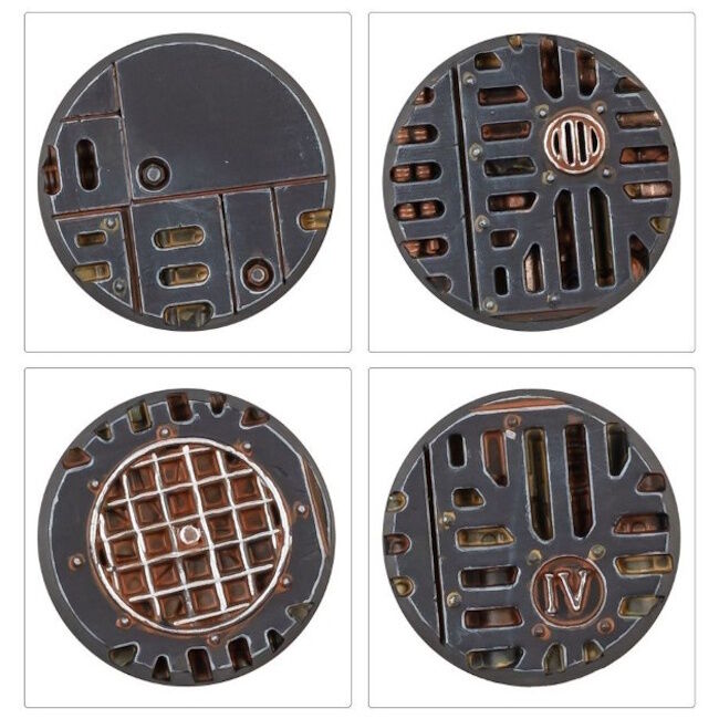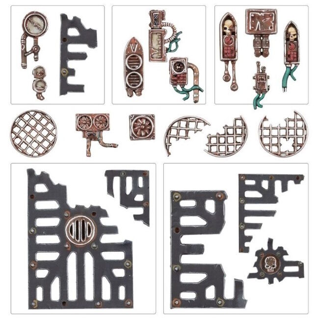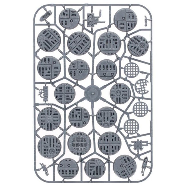 In addition to the bases, this kit contains loads pieces of grim and industrial basing material to add detail and narrative elements to your miniatures, such as gantry sections, broken grille panels, discarded fans, shattered gauges, and time-worn vox relays.