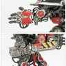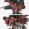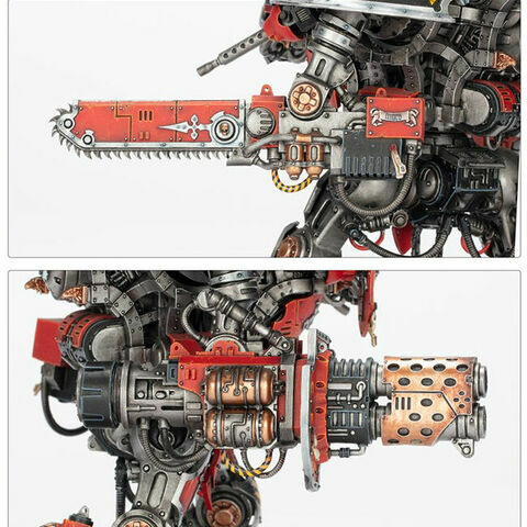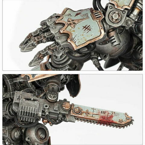 Knight Despoiler, armed with a reaper chainsword (which can be replaced with a daemonbreath thermal cannon, despoiler gatling cannon and heavy darkflamer, or despoiler battle cannon and diabolus heavy stubber), warpstrike claw (which can be replaced with a daemonbreath thermal cannon, despoiler gatling cannon and heavy darkflamer, or despoiler battle cannon and diabolus heavy stubber), and a daemonbreath meltagun (which can be replaced with a diabolus heavy stubber). Can also be armed with an optional havoc missile pod, ruinspear rocket pod, or hellstorm autocannons