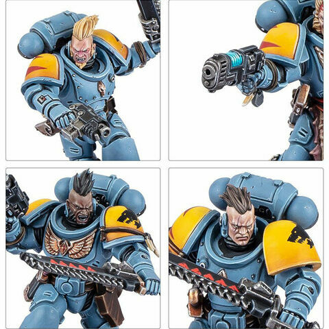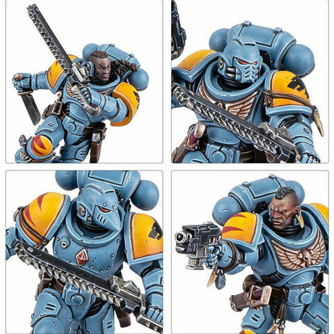 The kit includes parts to build an optional Pack Leader who can be armed with a chainsword, power sword, power axe, or lightning claw in one hand, while the other hand can be empty or carry a plasma pistol or bolt pistol. They have a choice of three heads – one helmeted and two bare – two backpack icons, and three shoulder pads – one featuring the sigil for Ragnar Blackmane's Great Company, one for Logan Grimnar's, and a blank one. The kit includes 24 heads and 22 shoulder pads, which are interchangeable across the rest of the squad, as are the weapons. There are also 14 combat knife sheaths, 16 pistol holsters, and four wolf tooth necklaces to further customise your impetuous warriors.