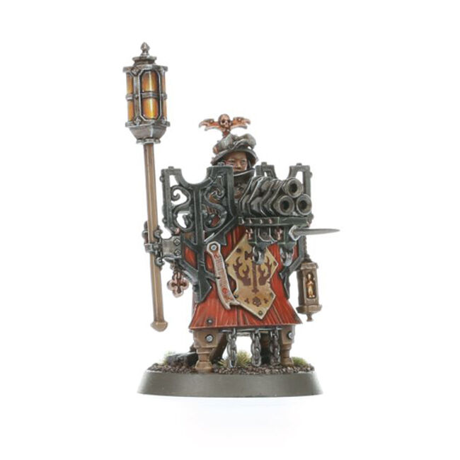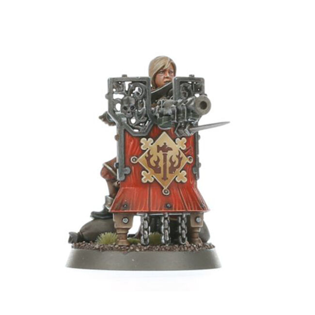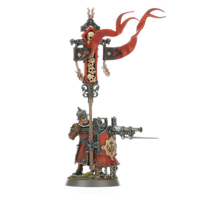 This multipart plastic kit builds 10 Freeguild Fusiliers, accompanied by a Blackpowder Squire. Each Fusilier carries a huge pavise shield, on which they mount a fusil-cannon tipped with a bayonet. You can build one model as a Fusil-Sergeant, armed with either a brace of pistols or a triple-barrelled slaughter-fusil, and another model as a Fusilier Herald, who a carries a standard and torch with a choice of icons and flames. The accompanying Blackpowder Squire runs up and down the firing line, supplying shot and powder wherever it's needed.