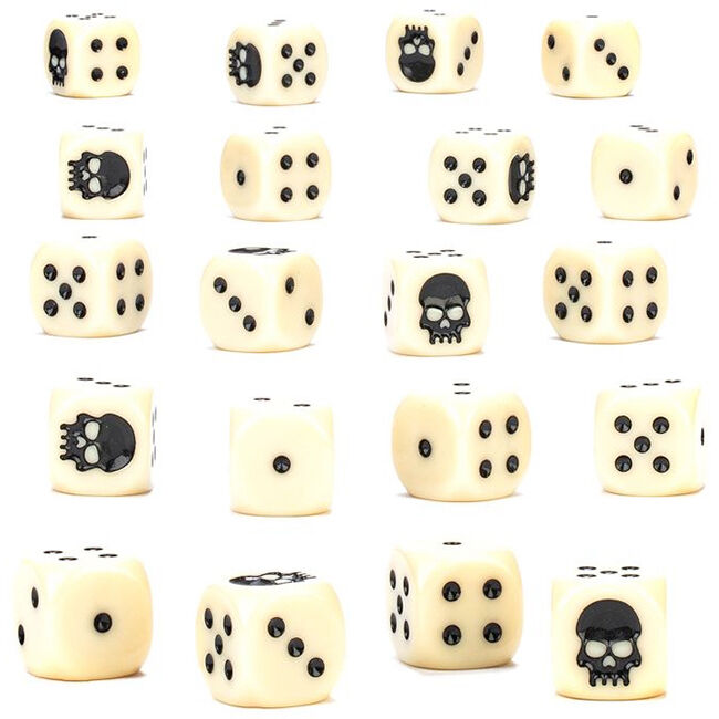 This is a set of 20 six-sided dice with rounded edges for use in games of Warhammer 40,000, Warhammer Age of Sigmar, Warhammer: The Horus Heresy, Warhammer: The Old World, and other systems. They are cast in ivory-coloured acrylic plastic with black ink markings, and measure 12mm along each edge. The 1-5 facings are traditionally pipped, and each '6' face is decorated with a grim skull icon.